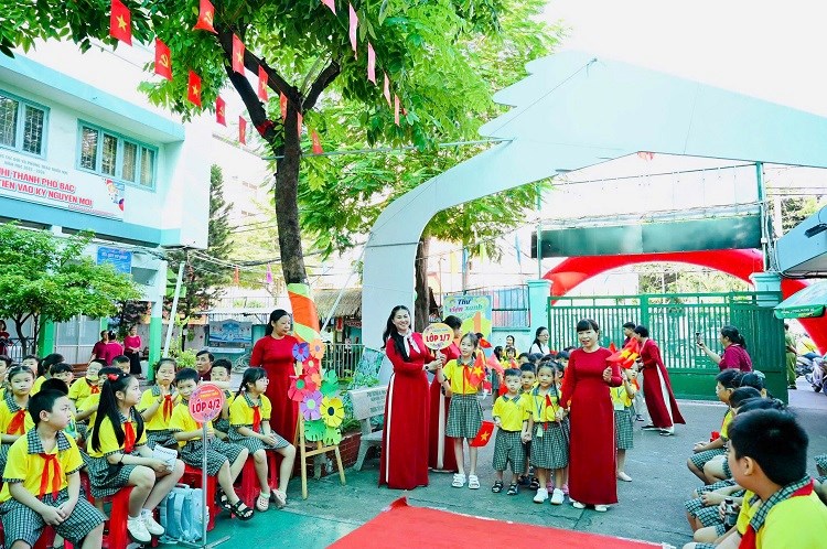 Buổi lễ bắt đầu với khoảnh khắc xúc động khi toàn trường chào đón 241 em học sinh khối lớp 1. Các em, với những gương mặt hồn nhiên, rạng rỡ, chính là những “bông hoa”, “niềm hy vọng” và “mầm non tương lai của đất nước”. Dưới sự dìu dắt của đội ngũ giáo viên chủ nhiệm và bảo mẫu giàu kinh nghiệm, các em đã tự tin bước vào ngôi nhà mới với bao niềm vui, niềm tự hào.